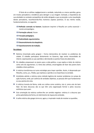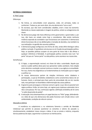1) A democracia grega era direta e participativa, com cidadãos governando e sendo governados, ao contrário das democracias representativas modernas. 2) A retórica era importante na Grécia antiga para convencer os outros em debates políticos, embora tenha sido criticada por alguns por primar a opinião sobre a verdade. 3) A educação cívica era essencial para preparar os cidadãos para a participação política na pólis.