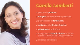 Camila Lamberti é uma designer de revestimentos cerâmicos premiada com 20 anos de experiência no setor. Ela trabalhou em várias empresas onde liderou equipes de design e desenvolvimento de produtos. Lamberti também é pesquisadora de tendências, palestrante, editora de blog e integrante de comitês do setor.