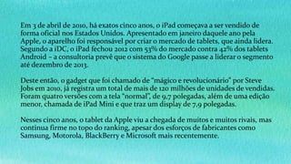 O documento descreve a retrospectiva dos 5 anos do iPad desde seu lançamento em 2010. O iPad revolucionou o mercado de tablets e ainda lidera o setor apesar da concorrência crescente de rivais como Samsung e Microsoft. Foram lançadas 5 versões do iPad desde 2010, com melhorias como tela Retina e processadores mais rápidos, mas os preços aumentaram consideravelmente no Brasil.