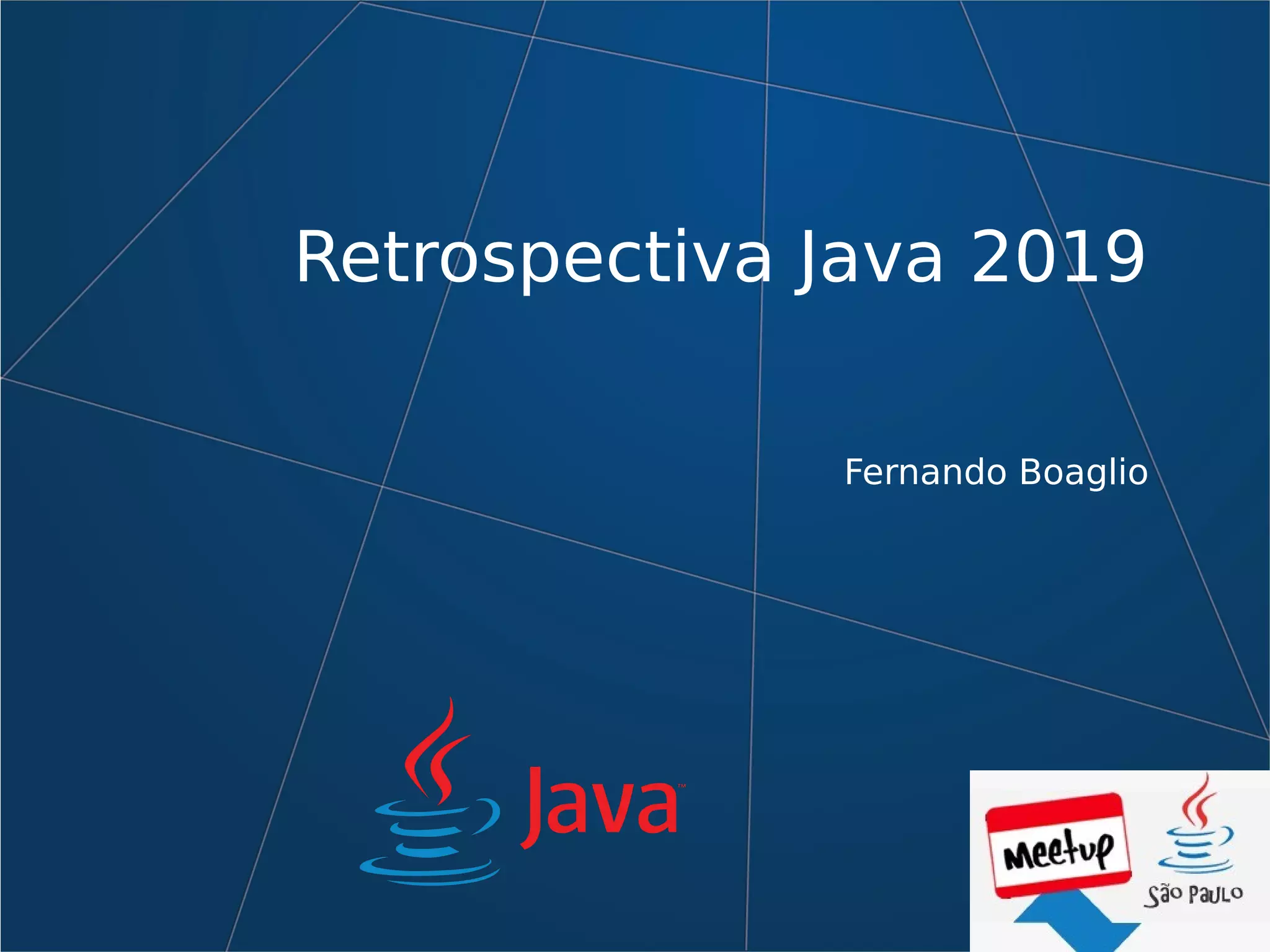 O documento apresenta uma retrospectiva do Java em 2019 dividida por trimestres, feita por Fernando Boaglio. Ele discute os principais acontecimentos e tendências do Java em cada período do ano, como lançamentos, frameworks e tecnologias relevantes. A fonte dos dados é o blog da JetBrains e no final Boaglio convida o leitor a participar da discussão.