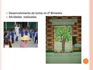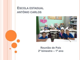 O documento resume a reunião de pais do 2o bimestre do 1o ano da Escola Estadual Antônio Carlos. Nele, são apresentados os resultados escolares dos alunos nas diferentes disciplinas, com a maioria obtendo notas A. Há também avisos sobre uniformidade, hábitos de estudo, festa da família e visitas culturais.