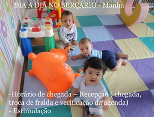 O documento apresenta a programação semanal de atividades para o Berçário, incluindo atividades lúdicas, de linguagem, psicomotricidade e exploração, com o objetivo de estimular o desenvolvimento integral das crianças. Também traz informações sobre horários, alimentação, materiais necessários e normas da escola.