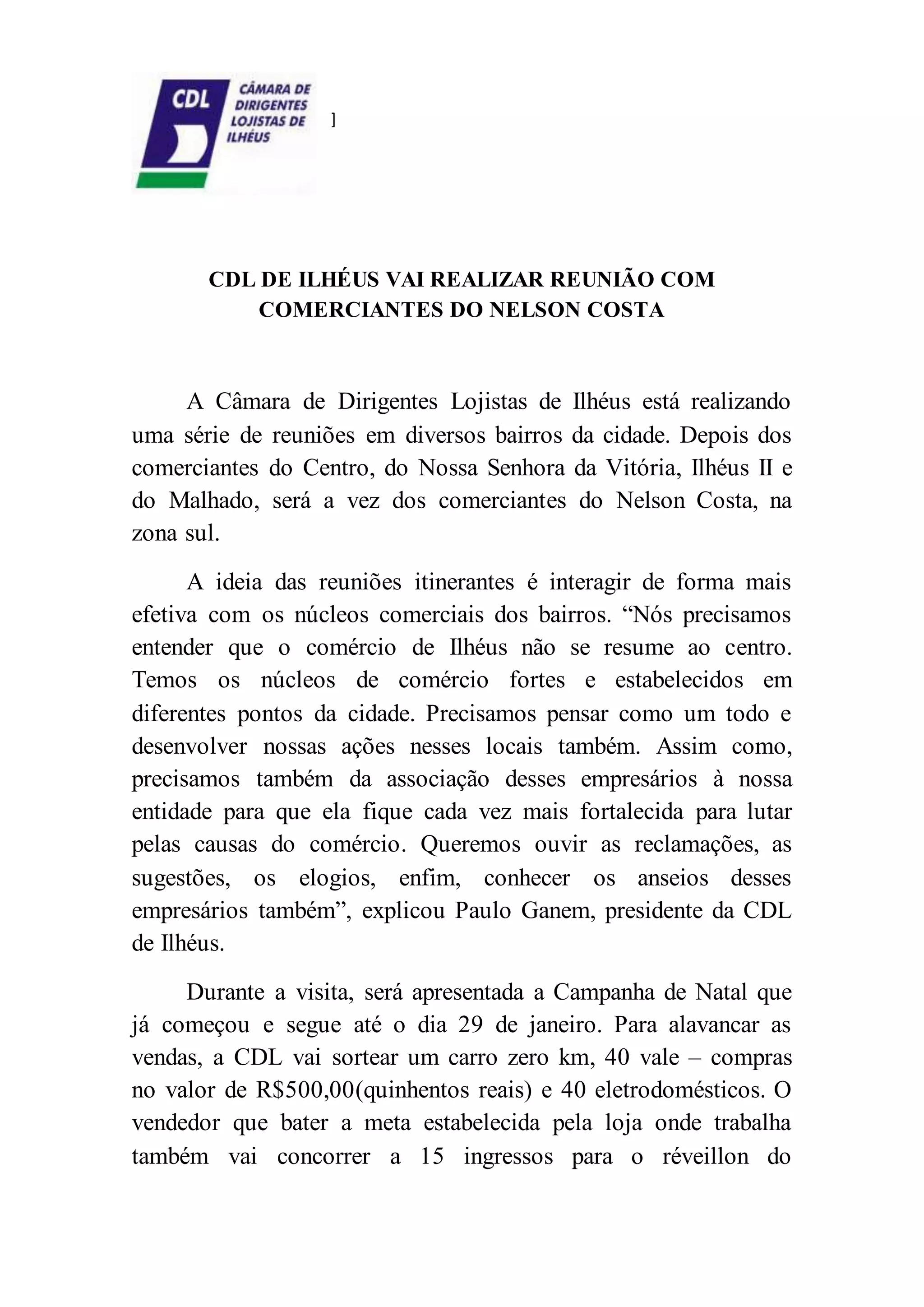 A CDL de Ilhéus realizará uma reunião com comerciantes do bairro Nelson Costa para apresentar sua campanha de Natal e ouvir sugestões e reclamações. A ideia é interagir com os diversos núcleos comerciais da cidade e fortalecer a associação dos empresários à entidade.