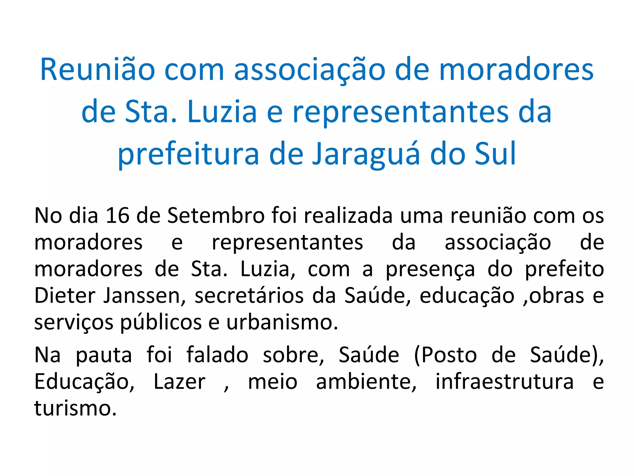 Uma reunião foi realizada entre moradores da associação de moradores de Sta. Luzia e representantes da prefeitura de Jaraguá do Sul para discutir assuntos como saúde, educação, lazer, meio ambiente, infraestrutura e turismo na região. Alunos do 1o ano apresentaram algumas dificuldades encontradas no bairro. Os secretários de saúde, urbanismo e obras estiveram presentes, assim como o prefeito Dieter Janssen.