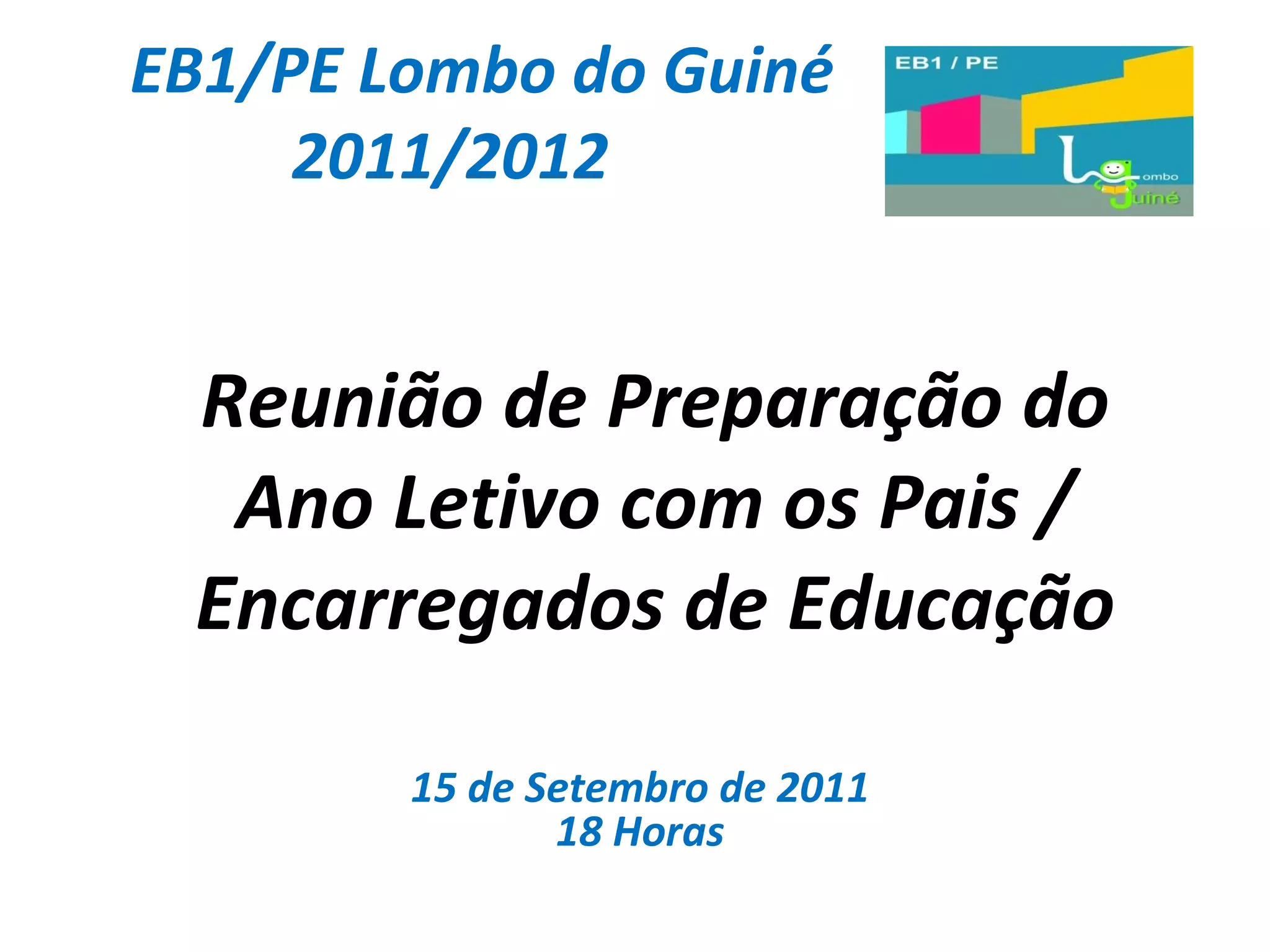 Este documento resume uma reunião de preparação do ano letivo com pais e encarregados de educação. Apresenta o corpo docente e não docente, informações de contacto, organização das turmas, calendário escolar, manuais adotados, projetos educativos, plano anual de atividades, eleição da liga de pais, transporte escolar e plano de contingência para a gripe A.