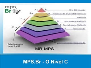 O documento descreve o Nível C do MPS.Br, incluindo os processos de Gerência de Riscos, Desenvolvimento para Reutilização e Análise de Decisão e Resolução. Ele se concentra no processo de Desenvolvimento para Reutilização, listando seus resultados esperados, e fornece estatísticas sobre empresas certificadas no Nível C, como a PowerLogic, que implementou com sucesso o processo de Desenvolvimento para Reutilização.