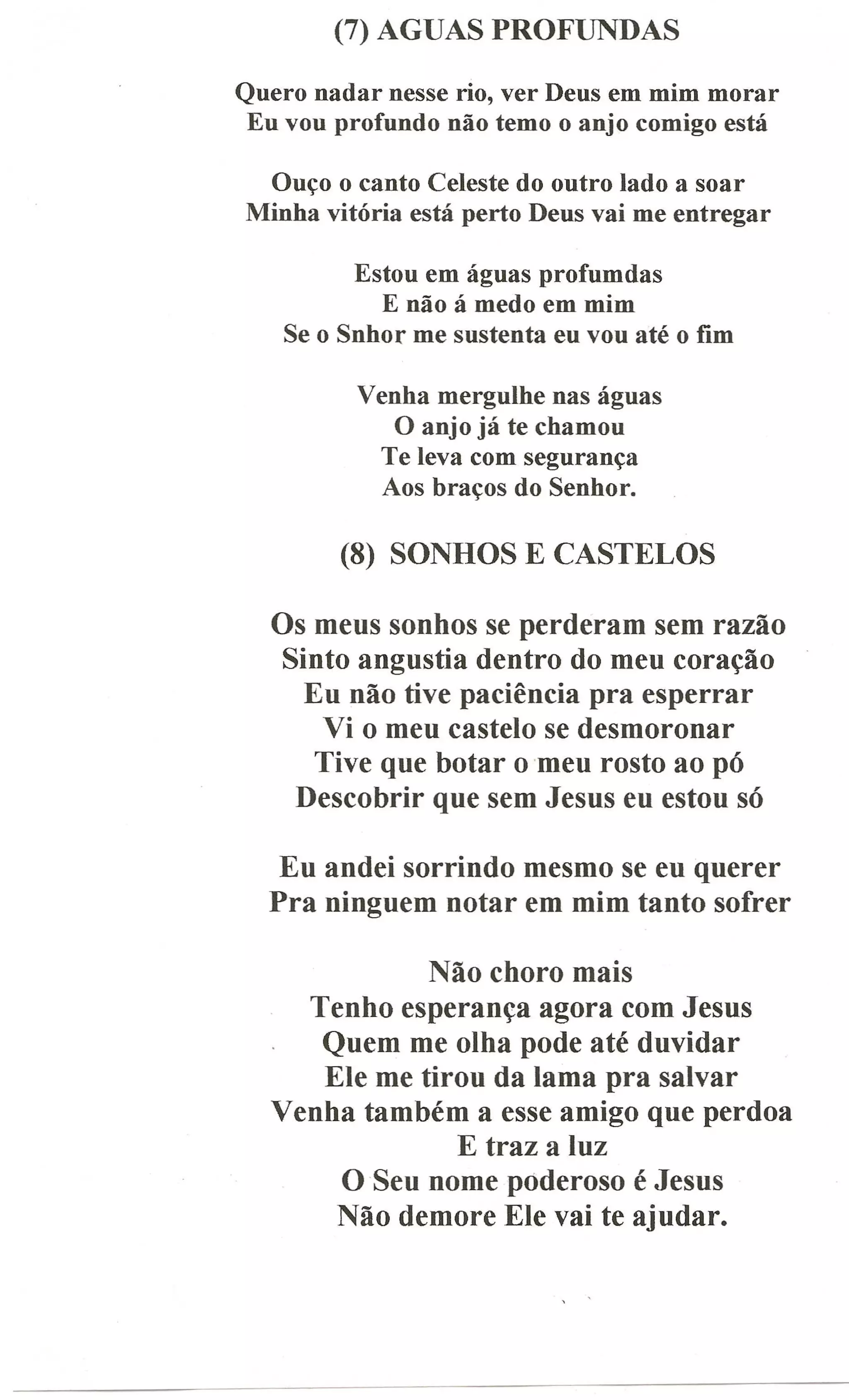 O documento fala sobre a profundidade das águas de Deus e como Ele sustenta aqueles que nadam nelas, levando-os seguramente aos Seus braços. Também descreve como Jesus tirou a pessoa da lama e trouxe luz e esperança ao seu coração, perdoando-a e oferecendo ajuda.
