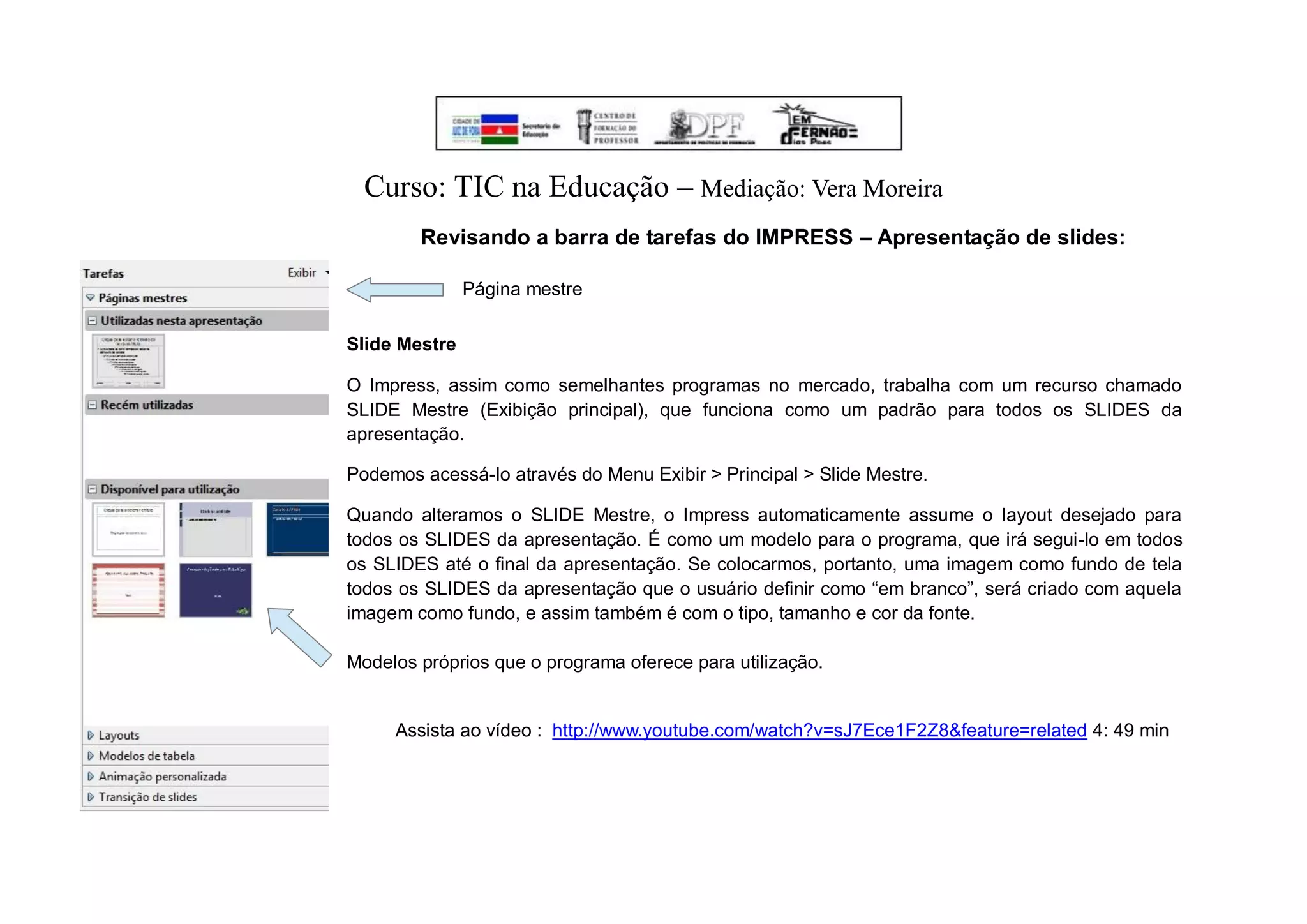O documento fornece instruções sobre como usar recursos como slides mestres, layouts, tabelas, animações, transições e áudio em apresentações do LibreOffice Impress. Ele explica como formatar slides usando estilos predefinidos, inserir conteúdo em caixas de texto e organizar os slides usando tópicos. Vídeos adicionais são fornecidos para dar mais detalhes sobre como usar esses recursos.