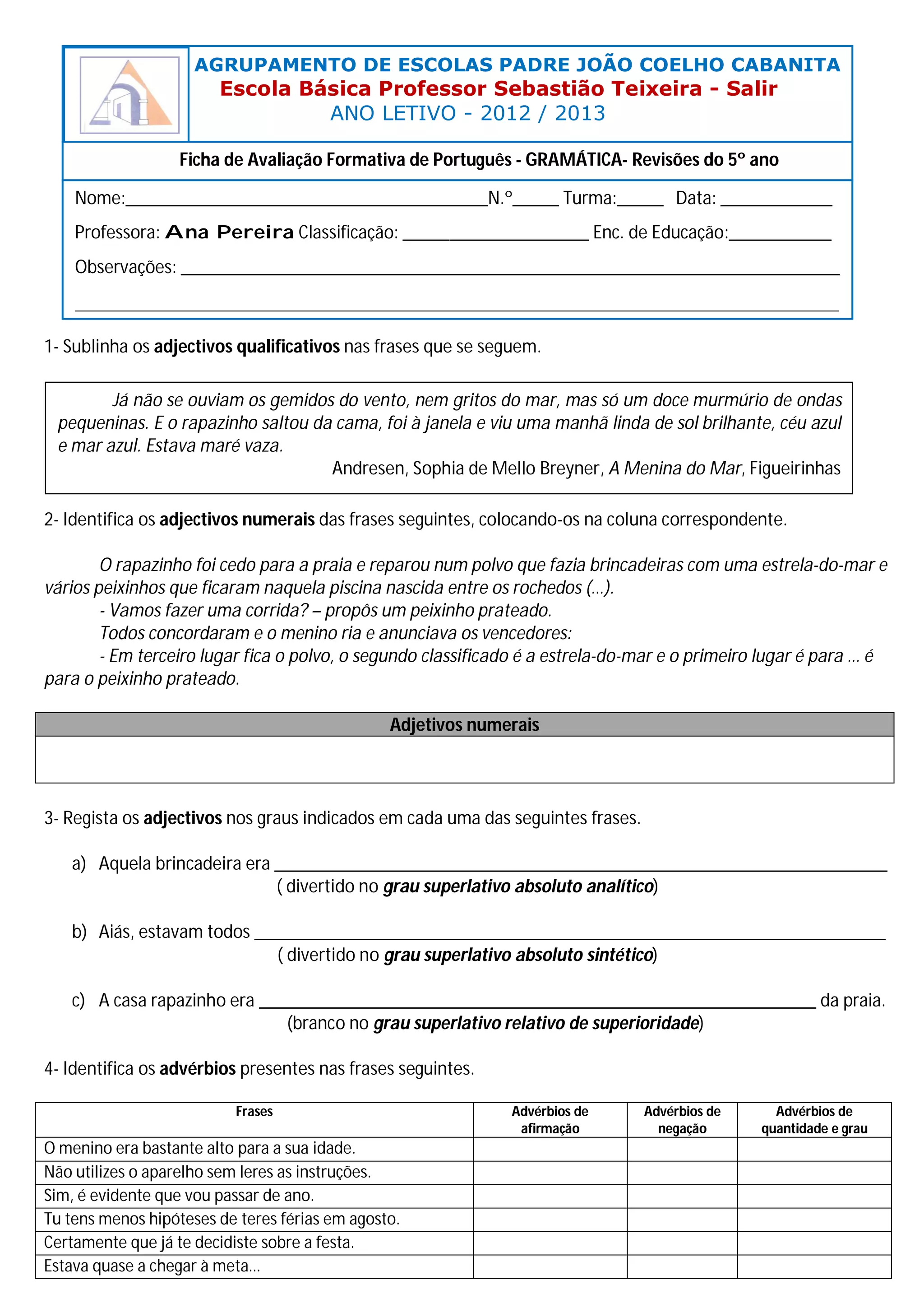 Esta ficha de avaliação formativa de Português para o 5o ano aborda vários tópicos gramaticais como identificar adjetivos qualificativos e numerais, classificar verbos como transitivos ou intransitivos, e reconhecer grupos nominais, verbais e preposicionais. A ficha inclui também exercícios sobre sinónimos e antónimos, conjunções, onomatopeias e contrações.