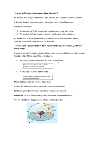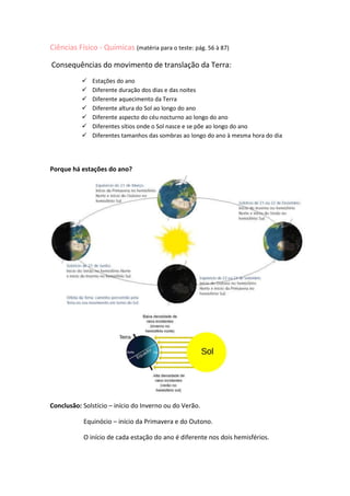 1) O documento discute as consequências do movimento de translação da Terra, incluindo as estações do ano, a duração dos dias e noites, e o aquecimento variável da Terra.