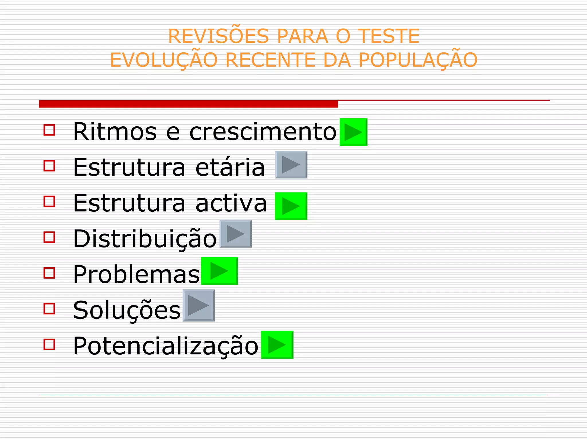 O documento discute a evolução recente da população portuguesa. As taxas de natalidade, mortalidade e crescimento populacional variaram nas últimas décadas devido a fatores como planejamento familiar, educação das mulheres, envelhecimento da população e migração. Isso levou a mudanças na estrutura etária e distribuição geográfica da população, com desafios no litoral e interior. Soluções propostas incluem desenvolvimento regional equilibrado e infraestrutura.