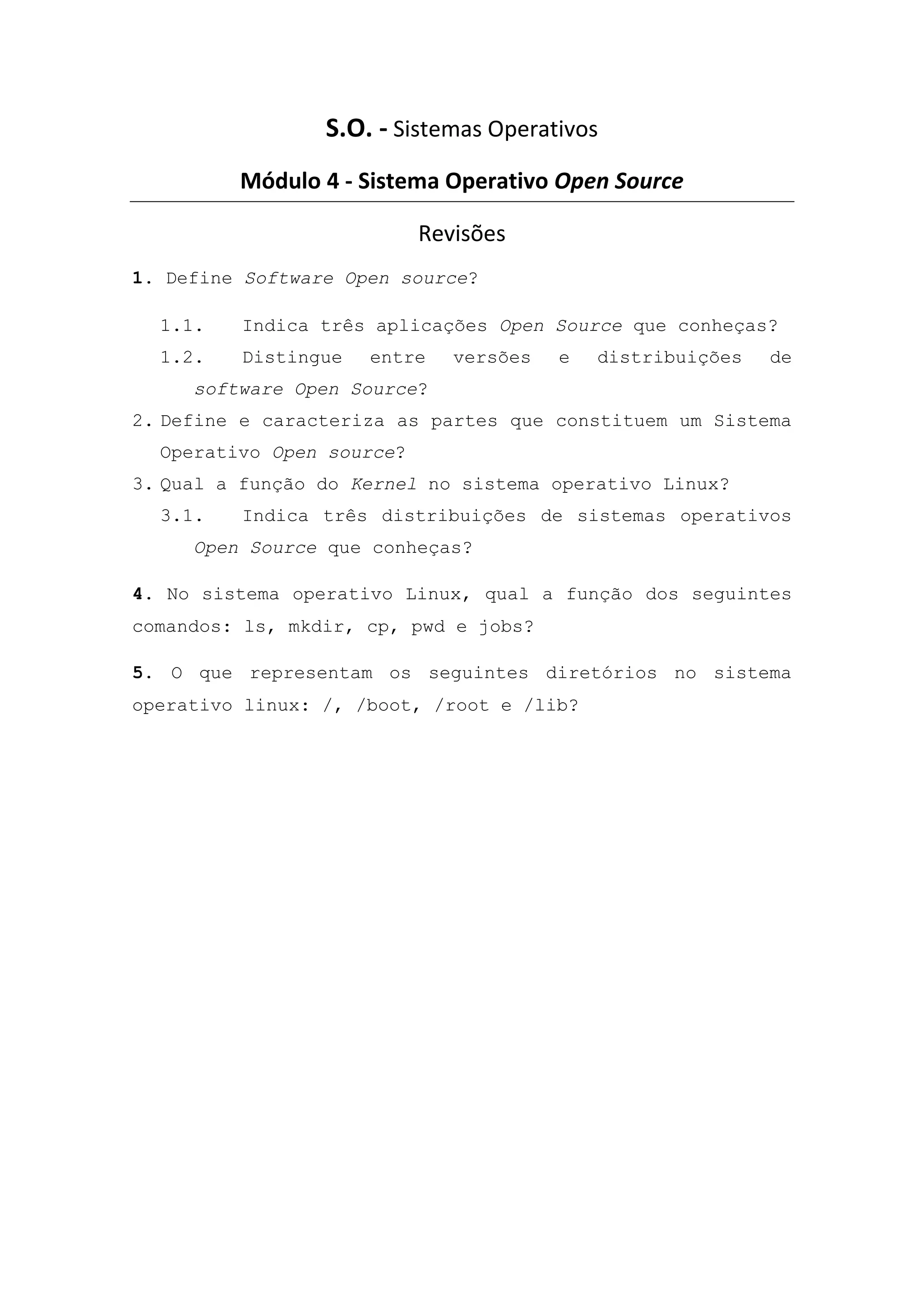 O documento discute sistemas operativos open source, definindo software open source, distinguindo versões e distribuições, caracterizando as partes de um sistema operativo open source e discutindo o kernel Linux e funções de comandos e diretórios comuns como /, /boot, /root e /lib.
