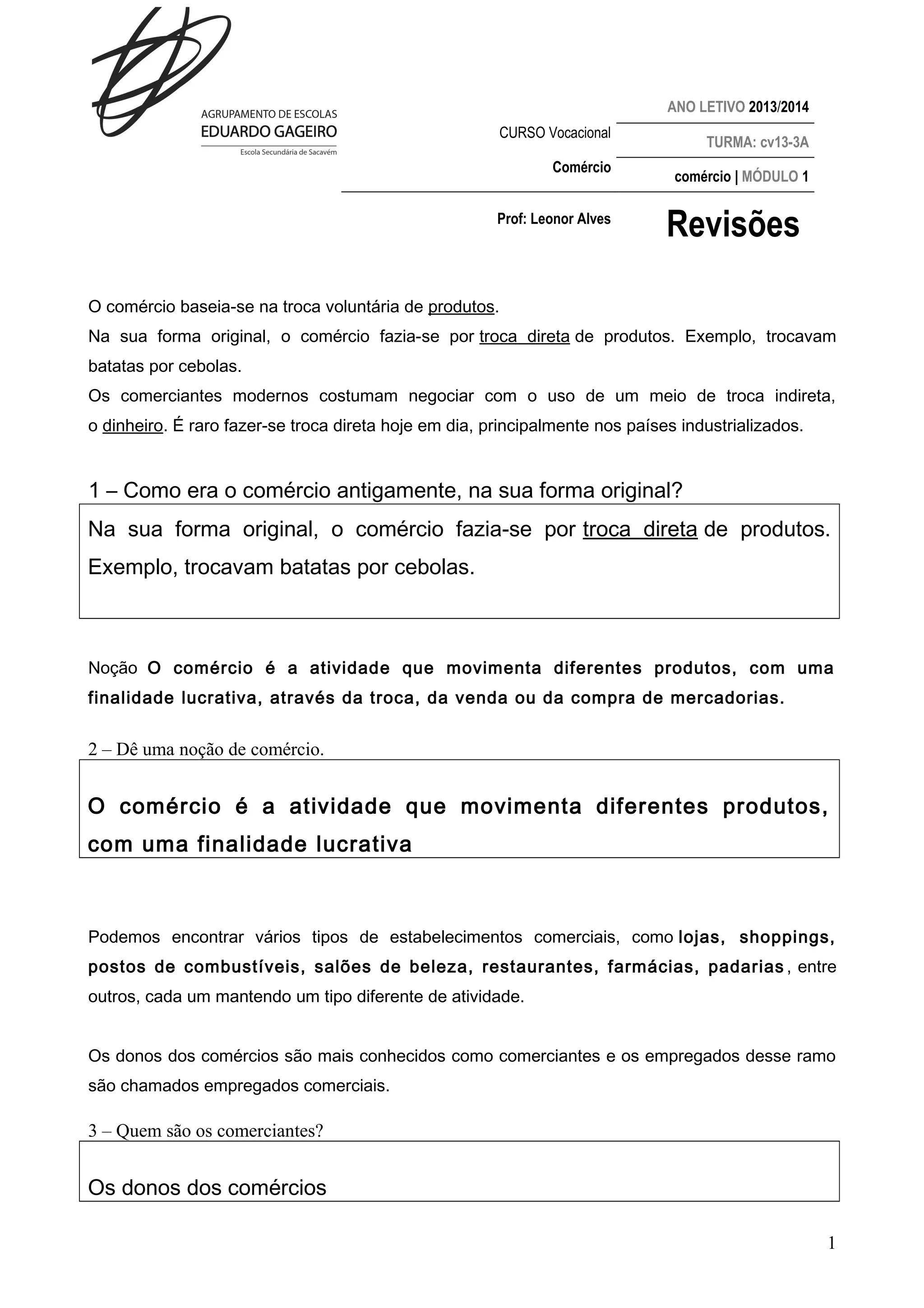 O documento trata de um curso de comércio no ano letivo de 2013/2014. Aborda conceitos como a origem do comércio por troca direta, os tipos de comerciantes e empregados do comércio, além de exportações e importações.