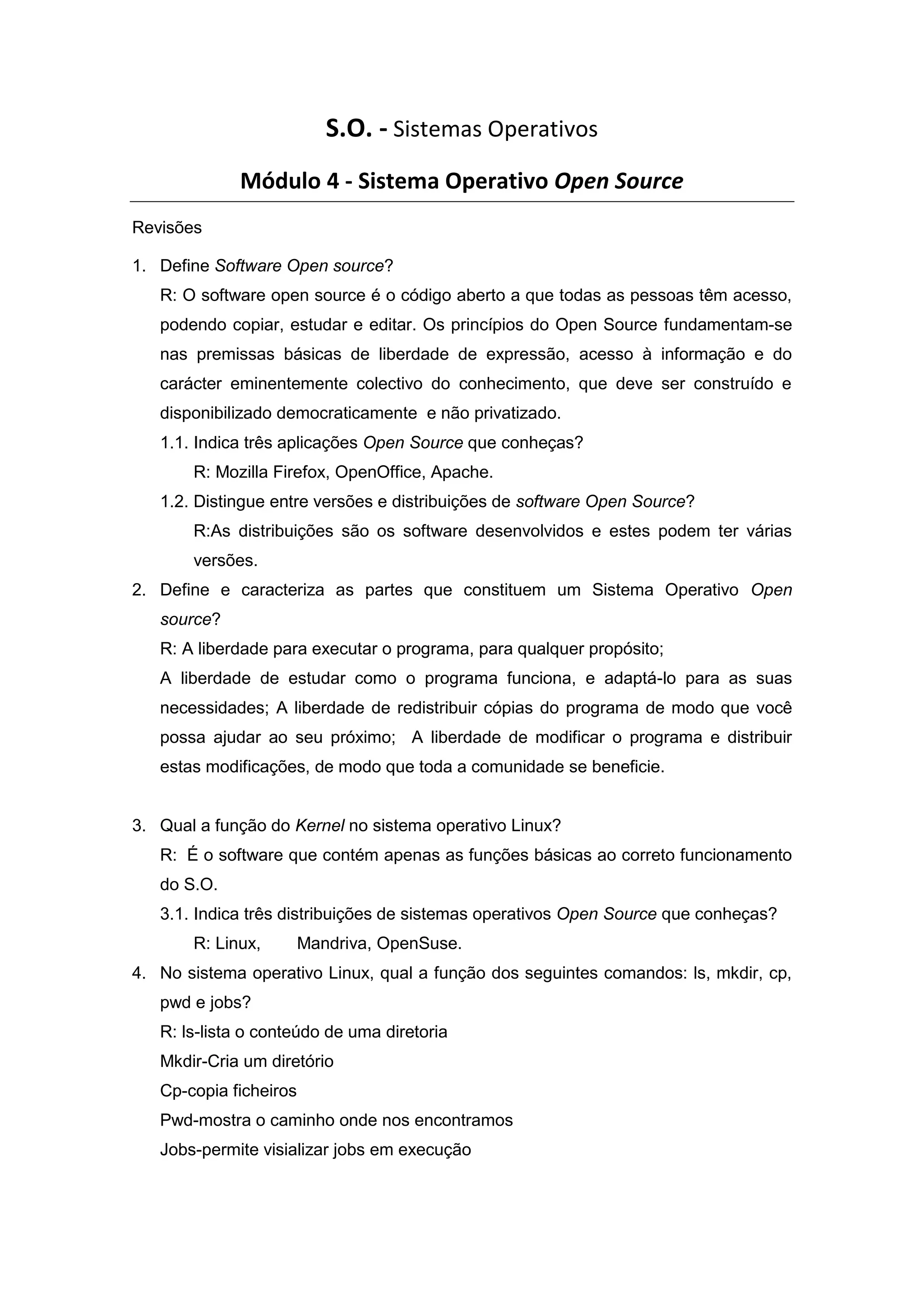 O documento discute sistemas operativos open source, definindo software open source e listando exemplos como Firefox, OpenOffice e Apache. Também caracteriza as partes que compõem um sistema operativo open source e discute a função do kernel no Linux, com exemplos de distribuições como Linux, Mandriva e OpenSuse. Finalmente, explica a função de comandos como ls, mkdir, cp e jobs e o significado de diretórios como /, /boot, /root e /lib.