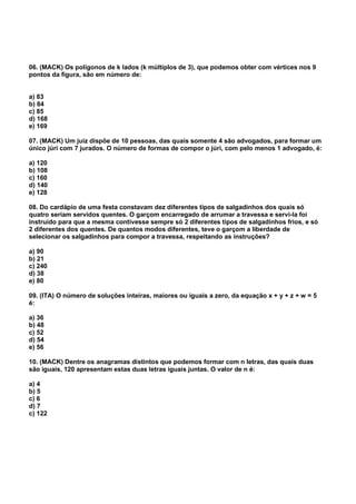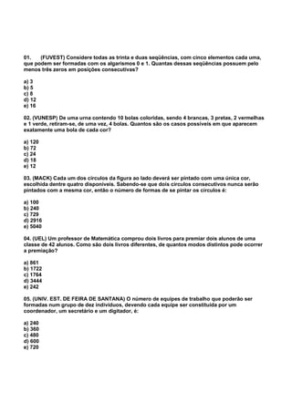 Este documento contém 30 questões sobre progressões aritméticas, progressões geométricas e razões e proporções. As questões abordam tópicos como determinar termos, razões e somatórias de PAs e PGs, além de dividir quantidades em partes proporcionais.