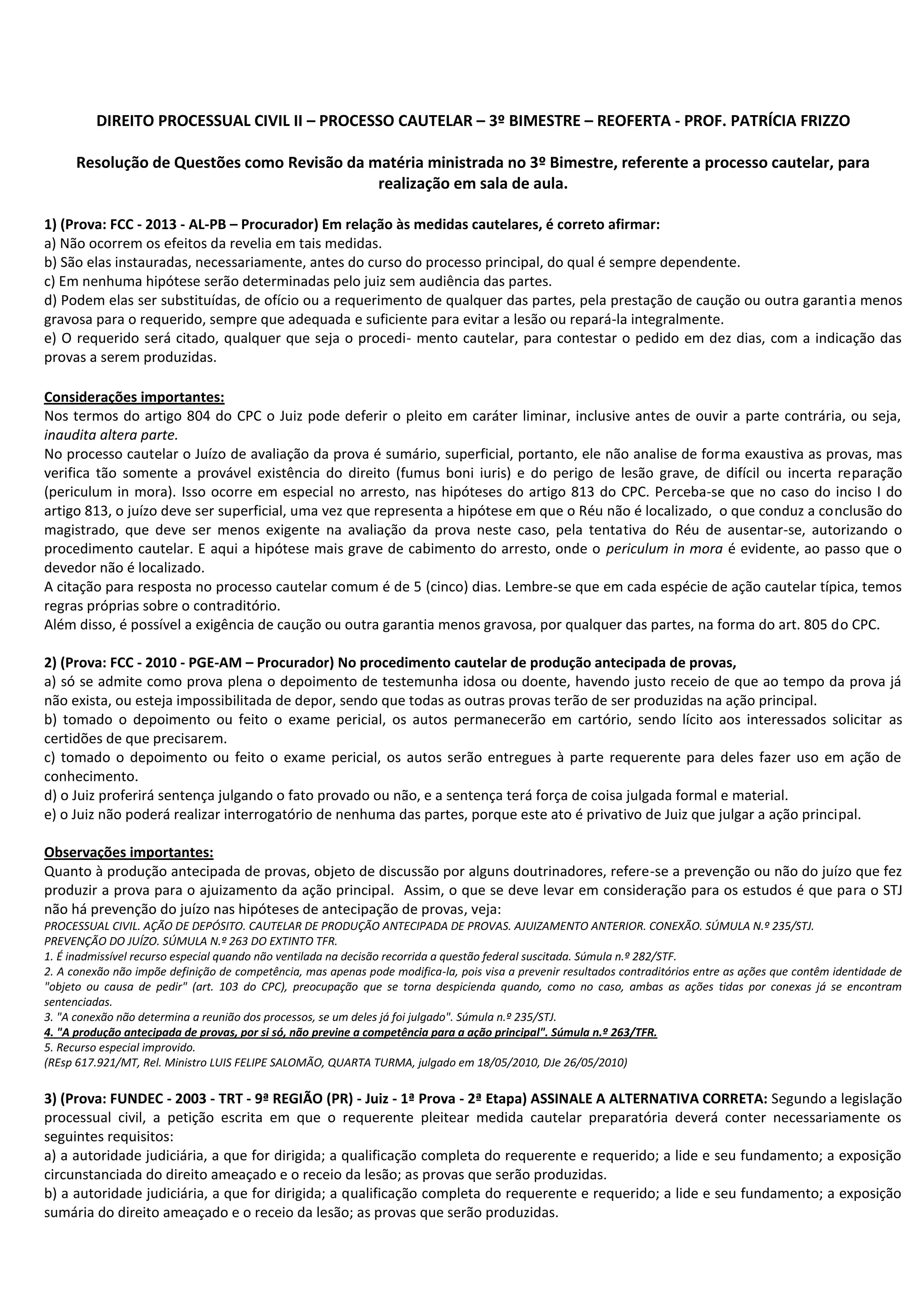 I. O documento apresenta questões sobre processo cautelar, abordando temas como arresto, produção antecipada de provas e exibição de documentos.
