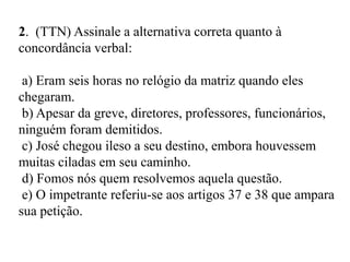 O documento apresenta uma revisão sobre concordância verbal com 12 questões sobre o assunto. As questões abordam temas como uso de verbos no presente do indicativo, concordância entre sujeito e verbo, uso de verbos como "haver" e "ser", entre outros pontos gramaticais relacionados à concordância verbal.