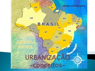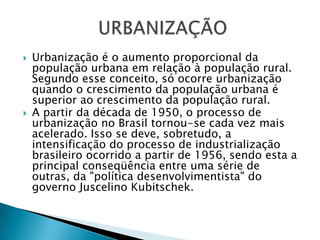 Urbanização é o aumento proporcional da população urbana em relação à rural. No Brasil, a urbanização acelerou-se a partir da década de 1950 devido à industrialização, e atualmente 81,2% da população é urbana. As cidades brasileiras enfrentam problemas como enchentes, poluição, violência e falta de saneamento básico.