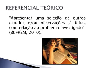 O documento aborda a importância da revisão bibliográfica na pesquisa, destacando passos para levantamento e seleção de fontes confiáveis. Enfatiza a necessidade de citar e discutir trabalhos anteriores, estabelecendo relações entre diferentes autores e teorias. Além disso, orienta sobre a estruturação do texto e a padronização das referências.
