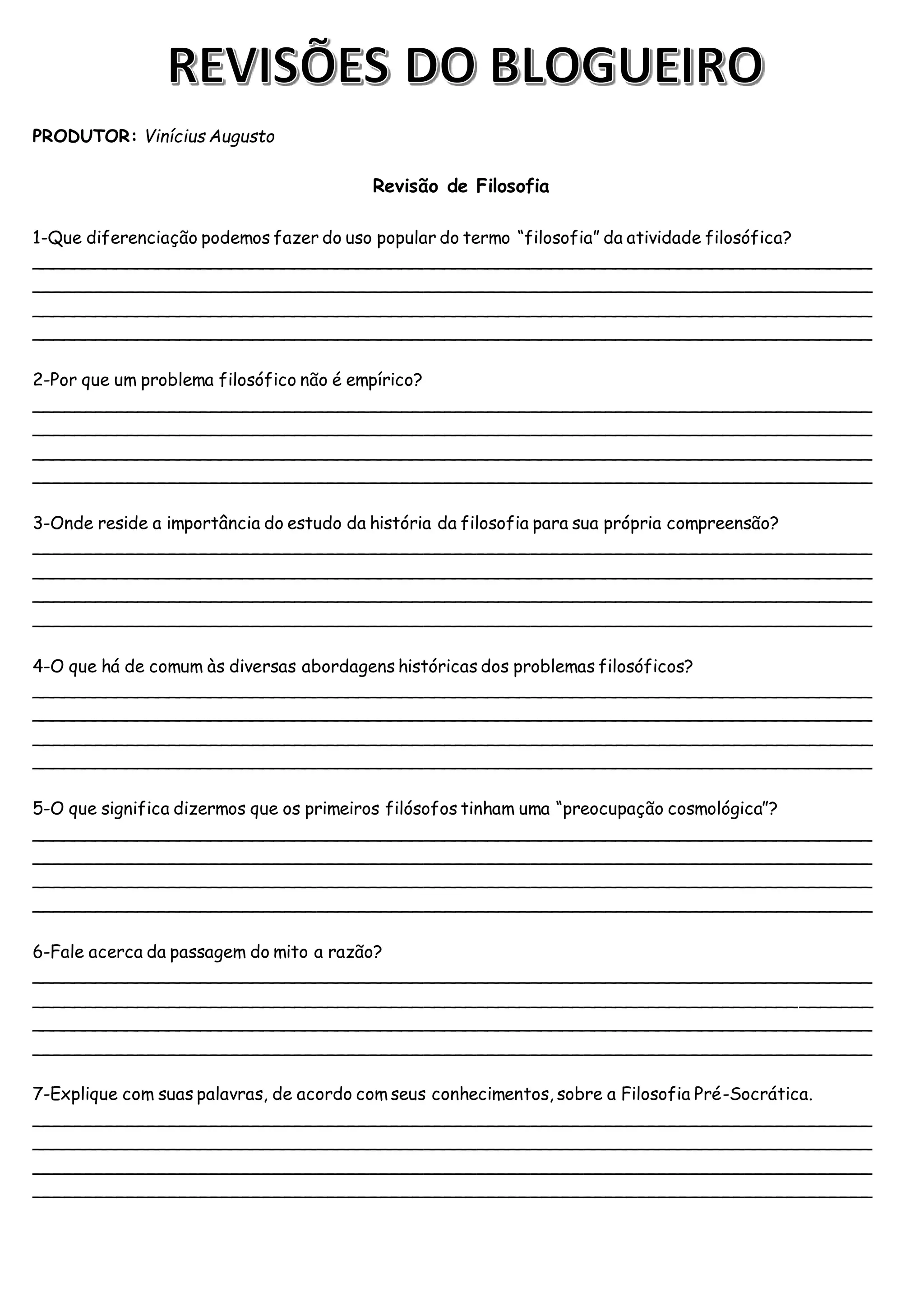 O documento apresenta perguntas sobre filosofia pré-socrática, incluindo sobre Tales de Mileto. As perguntas discutem os primeiros filósofos, seus pensamentos sobre a origem do mundo e mudança do mito para a razão. Uma pergunta é sobre o filósofo Tales de Mileto e seu pensamento de que a água era o princípio fundamental da natureza.