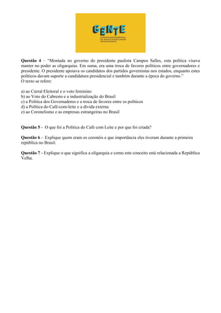 1) O documento discute a história da República Velha no Brasil, incluindo o coronelismo, a política do café-com-leite e a oligarquia.