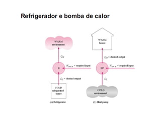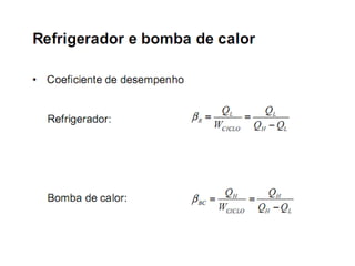 O documento discute vários tópicos da termodinâmica, incluindo: (1) tipos de pressão e propriedades de saturação; (2) ciclo de Carnot e sua eficiência máxima; (3) enunciados da segunda lei da termodinâmica sobre a impossibilidade de transferência total de calor de um corpo frio para um quente.