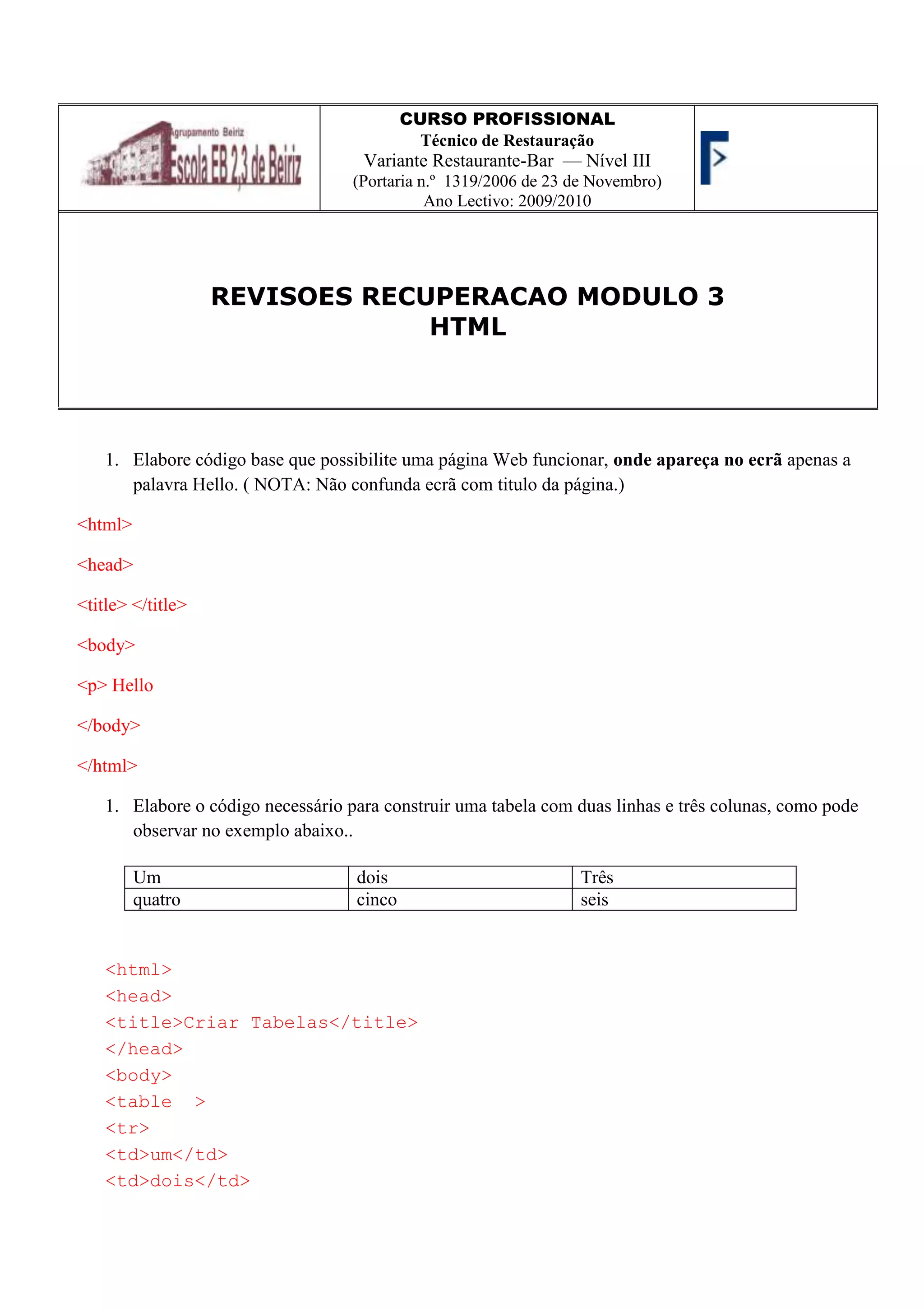 CURSO PROFISSIONALTécnico deRestauração Variante Restaurante-Bar — Nível III(Portaria n.º 1319/2006 de 23 de Novembro)Ano Lectivo: 2009/2010-1714545085REVISOES RECUPERACAO MODULO 3HTML<br /> <br />Elabore código base que possibilite uma página Web funcionar, onde apareça no ecrã apenas a palavra Hello. ( NOTA: Não confunda ecrã com titulo da página.) <html><br /><head><br /><title> </title><br /><body><br /><p> Hello <br /></body><br /></html><br />Elabore o código necessário para construir uma tabela com duas linhas e três colunas, como pode observar no exemplo abaixo..