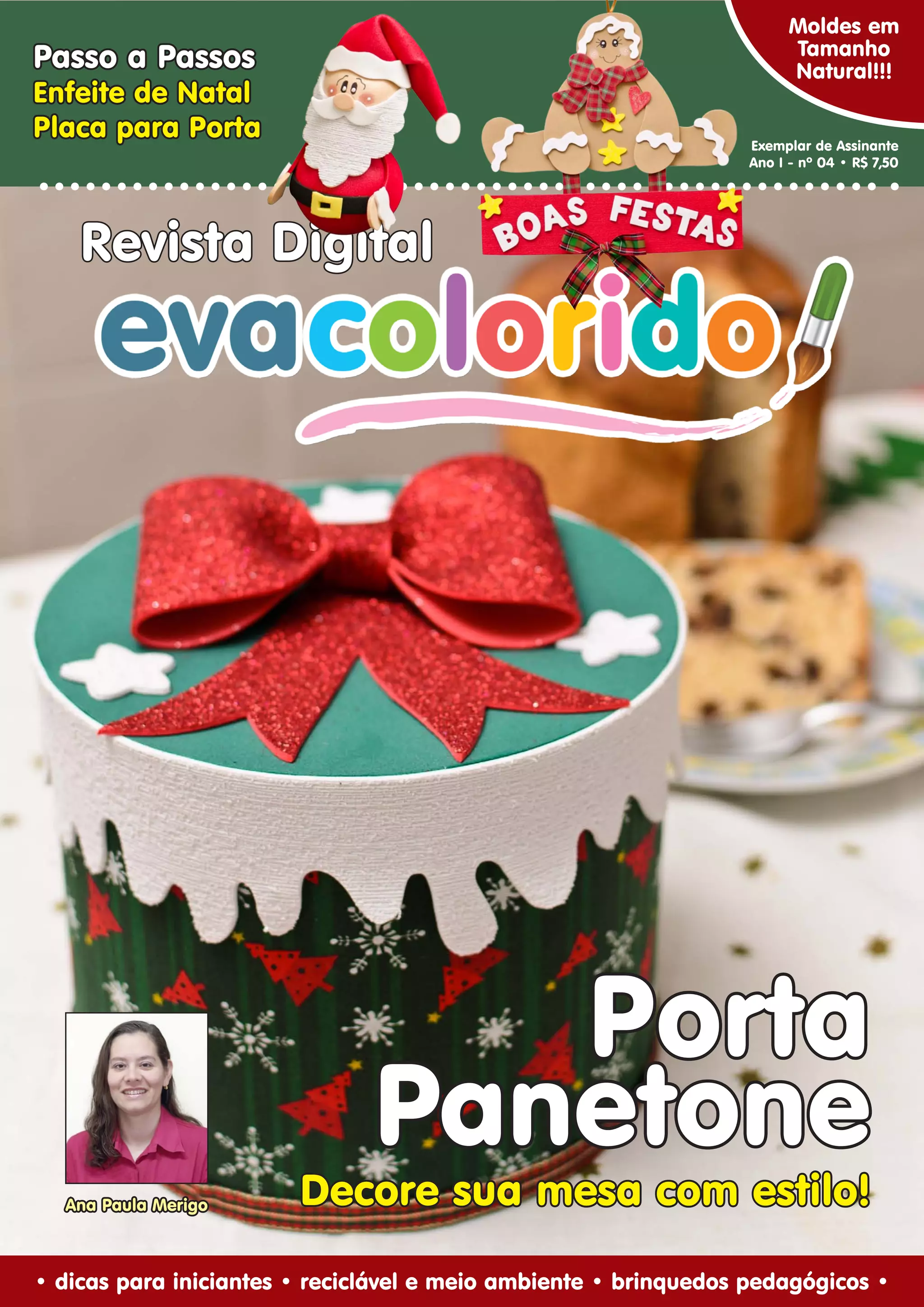 Este documento fornece instruções passo a passo para fazer um enfeite de Natal em forma de Ginger. Ele inclui uma lista de materiais necessários, 31 etapas ilustradas para confeccionar a peça e 8 moldes para recortar as diferentes partes do Ginger em EVA. O documento também promove produtos relacionados à arte em EVA para o Natal.