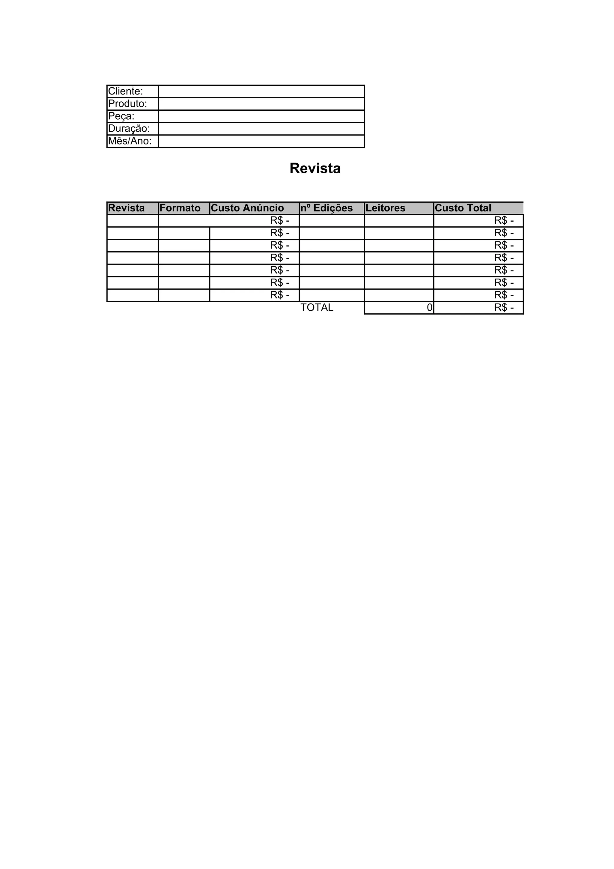 Este documento apresenta um planejamento de anúncios em revistas, com os detalhes de 7 revistas, incluindo formato, custo por edição, número de edições e leitores alcançados, com o cálculo do custo total de cada revista e o total geral. Além disso, apresenta um mapa de veiculação dos anúncios ao longo do ano, especificando em quais meses cada revista receberá os anúncios.