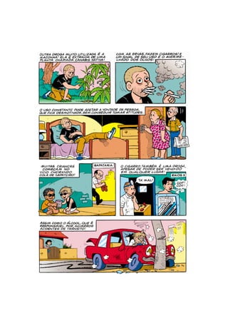 O documento discute os efeitos das drogas no cérebro e corpo humano, como o uso de drogas pode levar a dependência e problemas de saúde, e ressalta a importância de evitar o uso de drogas.