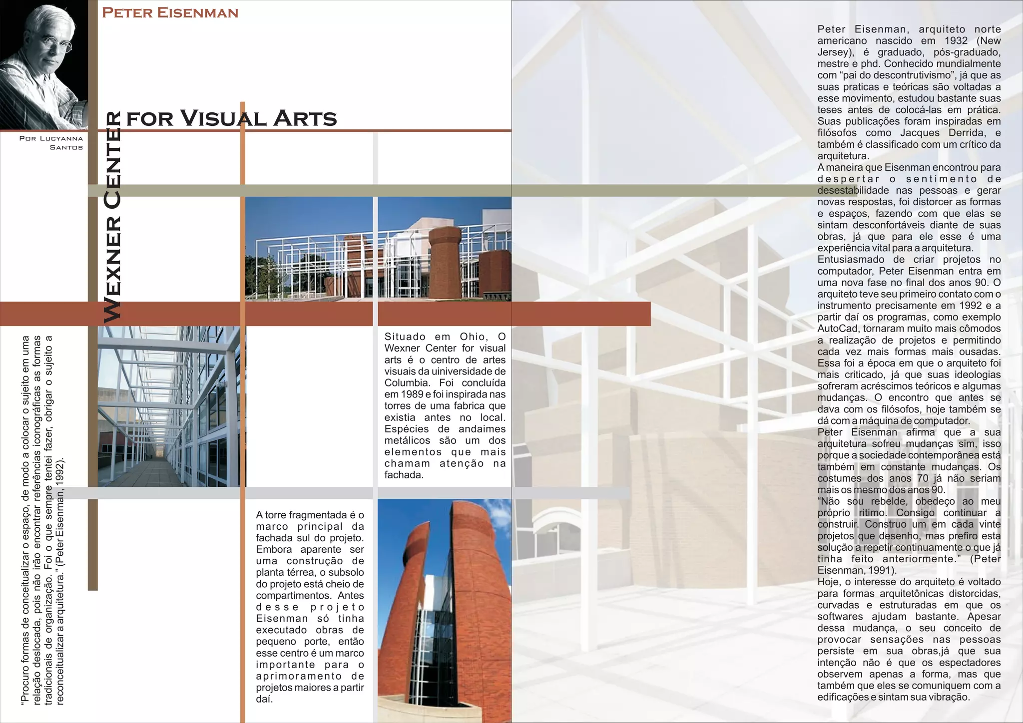 Peter Eisenman é um arquiteto norte-americano conhecido por seu trabalho desconstrutivista. Ele estudou filósofos como Derrida e busca provocar sentimentos de instabilidade e desconforto através de formas distorcidas. Seu uso pioneiro de softwares permitiu projetos mais ousados.