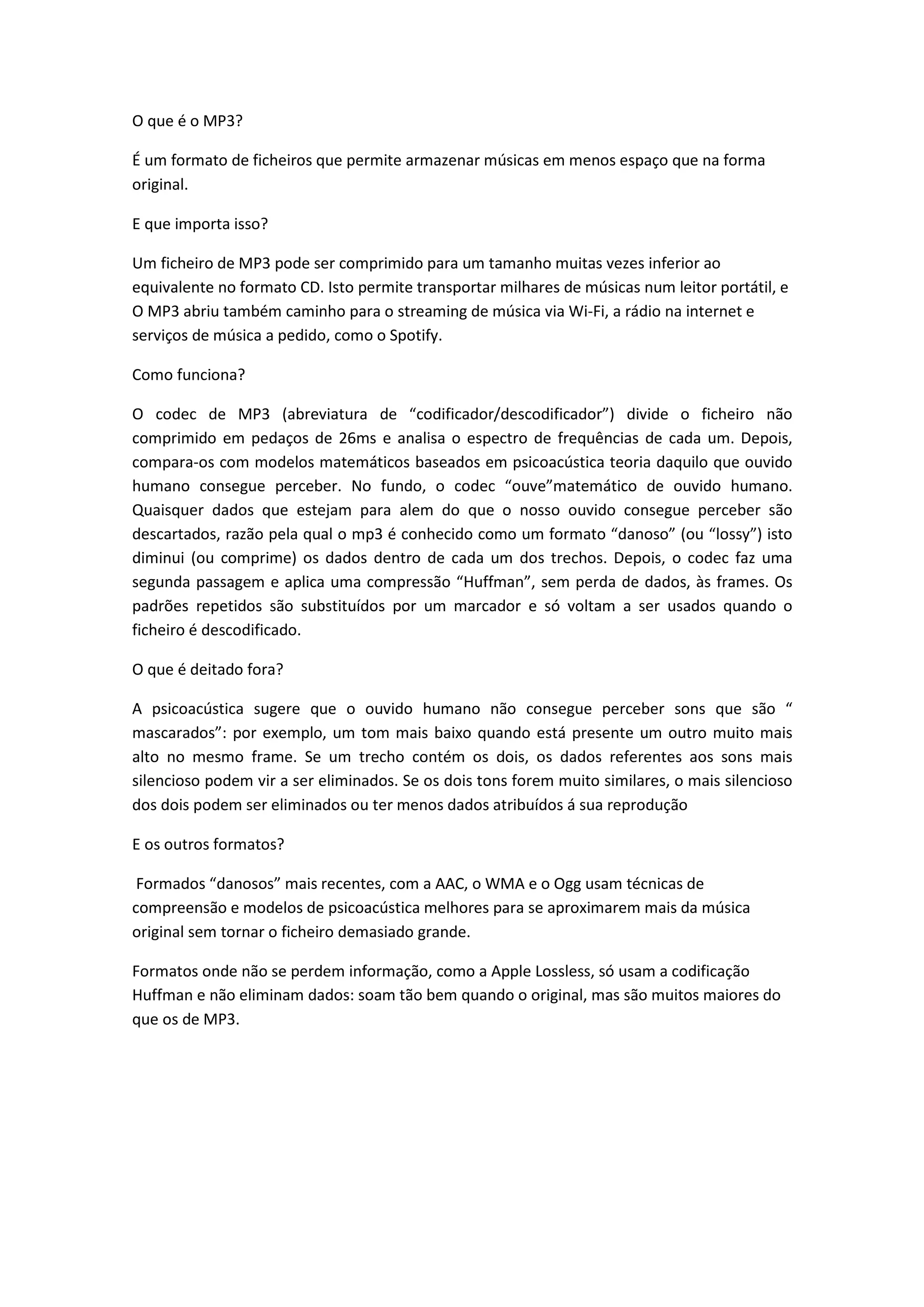 O MP3 é um formato de arquivo que comprime músicas usando psicoacústica para descartar dados inaudíveis, permitindo armazenar milhares de músicas em dispositivos portáteis. Ele analisa espectros de frequência e descarta dados que o ouvido humano não pode perceber, reduzindo muito o tamanho do arquivo sem perda perceptível de qualidade.