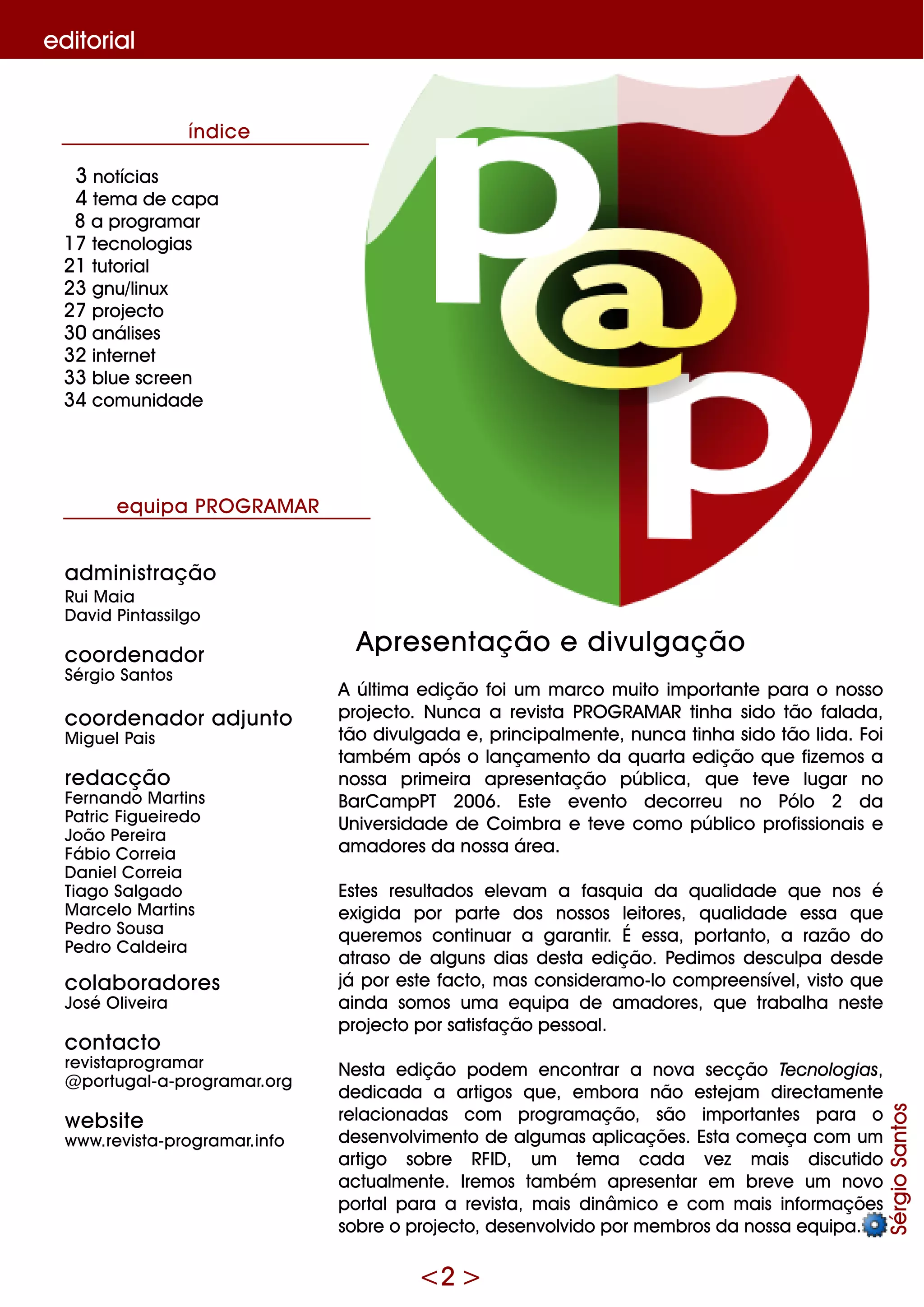 1. O documento apresenta um editorial da revista Programar, com informações sobre a administração, coordenação, redação e colaboradores da revista.