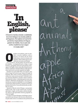 1) O documento discute a proposta de introduzir o ensino bilingue português-inglês nas escolas públicas portuguesas já no próximo ano letivo.