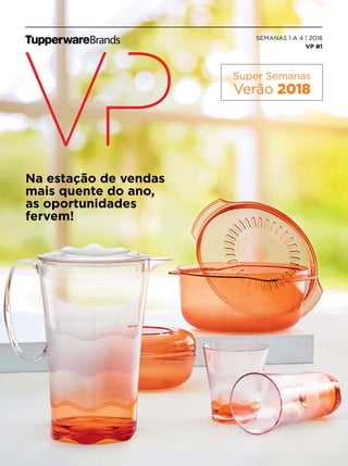 O documento promove as "Super Semanas Verão 2018" da Tupperware, com diversos produtos em oferta e brindes para consultores baseados em metas de vendas. As 3 frases principais são: