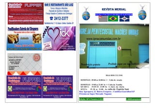 O documento é um boletim de uma igreja que lista os horários de cultos semanais, incluindo cultos de oração, da família, da vitória e do Espírito Santo, realizados nas quartas, sextas e domingos nas noites e manhãs em uma igreja localizada na Rua Igarapava em Guarulhos.