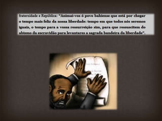 A Revolta Baiana, ocorrida em 1798, buscava a emancipação política do Brasil e o fim da escravidão, com a participação de diversos grupos sociais, incluindo escravos e seus descendentes. Entre os líderes estavam João de Deus, Luís Gonzaga e Lucas Dantas, que foram todos executados em resposta à repressão violenta do movimento. Influenciada pelos ideais da Revolução Francesa, a conjuração deixou um legado na luta por igualdade e liberdade na América Latina.