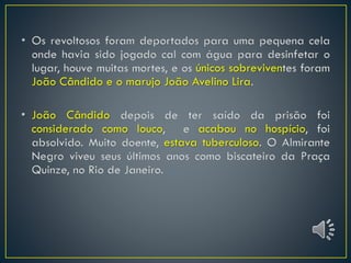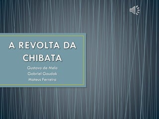 [1] A Revolta da Chibata ocorreu em 1910 no Rio de Janeiro em resposta aos castigos físicos dados aos marinheiros brasileiros, como 250 chibatadas aplicadas a um marinheiro. [2] Os marinheiros se revoltaram e assumiram o controle de navios da marinha brasileira. [3] Sob a liderança de João Cândido, os marinheiros exigiram o fim dos castigos físicos e melhorias nas condições de trabalho, sob ameaça de bombardear o Rio de Janeiro.