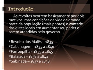 O documento discute as principais revoltas ocorridas no Brasil entre 1835 e 1841, incluindo suas causas e líderes. As revoltas foram motivadas por más condições de vida e desejo de maior poder político. Entre elas estão a Revolta dos Malês (escravos muçulmanos na Bahia), a Cabanagem (população pobre no Pará), e a Farroupilha (separatistas no Rio Grande do Sul).