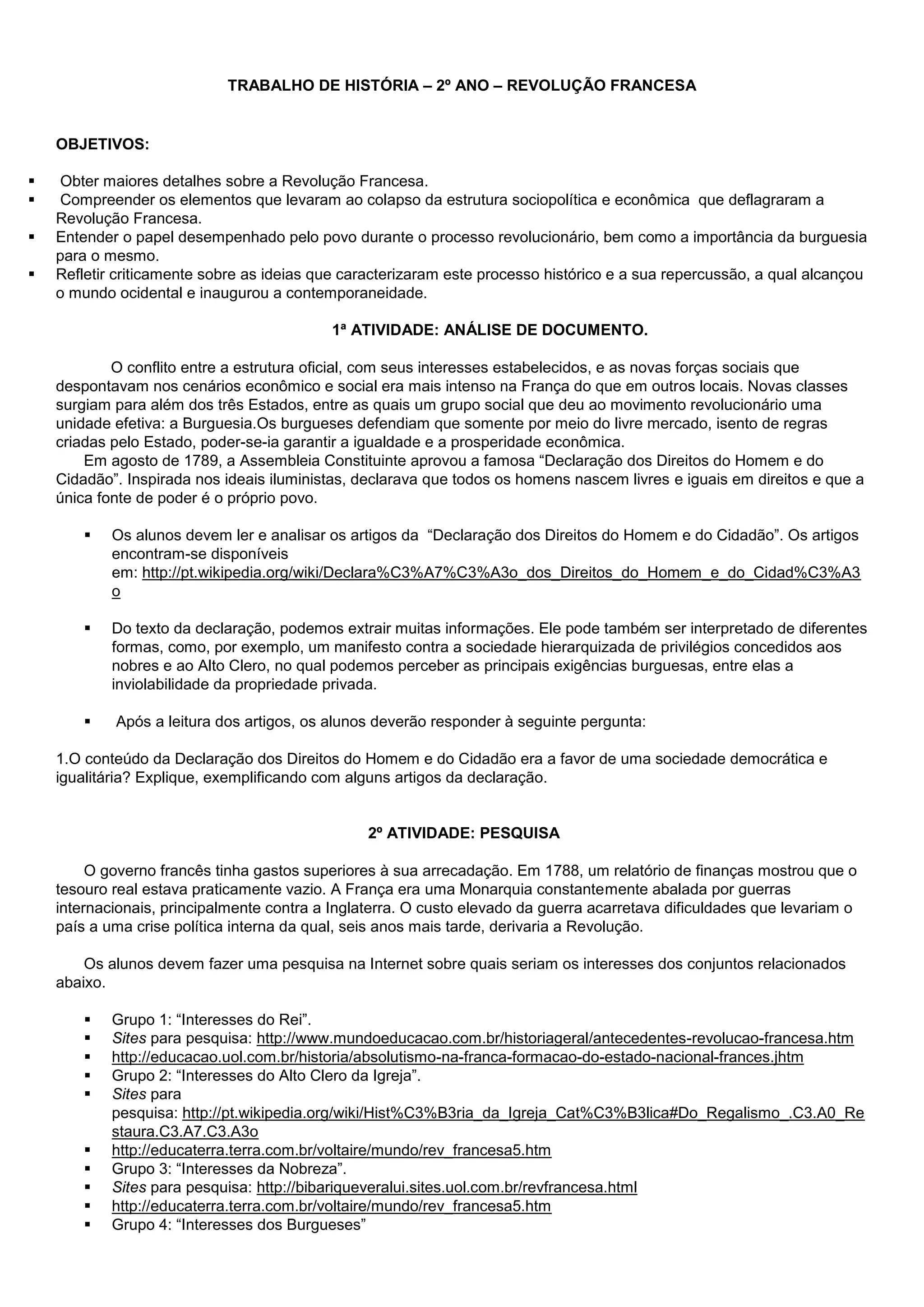 Este trabalho de história sobre a Revolução Francesa tem como objetivos compreender os elementos que levaram ao colapso da estrutura sociopolítica francesa e o papel desempenhado pelo povo durante o processo revolucionário. Os alunos devem analisar a Declaração dos Direitos do Homem e do Cidadão e pesquisar os interesses de diferentes grupos sociais franceses à época.