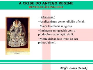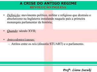A Revolução Inglesa (1642-1649) derrubou o absolutismo do rei Carlos I e estabeleceu a primeira monarquia parlamentar da história. A revolução foi causada pelos atritos entre o rei e o parlamento sobre impostos e religião. Após uma guerra civil de 7 anos, Carlos I foi decapitado e Oliver Cromwell instaurou uma ditadura puritana até 1660, quando a monarquia foi restaurada sob Carlos II.
