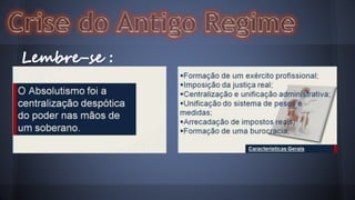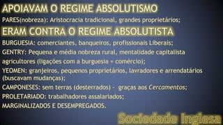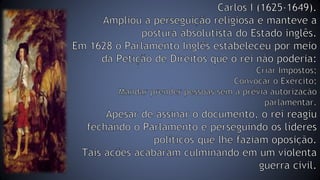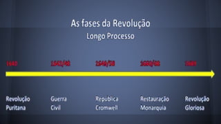 O documento descreve o contexto histórico e os principais eventos da Revolução Inglesa entre 1640 e 1689, que derrubou o absolutismo monárquico e estabeleceu a primeira monarquia parlamentar da história, com limites ao poder real e proteção de liberdades civis.