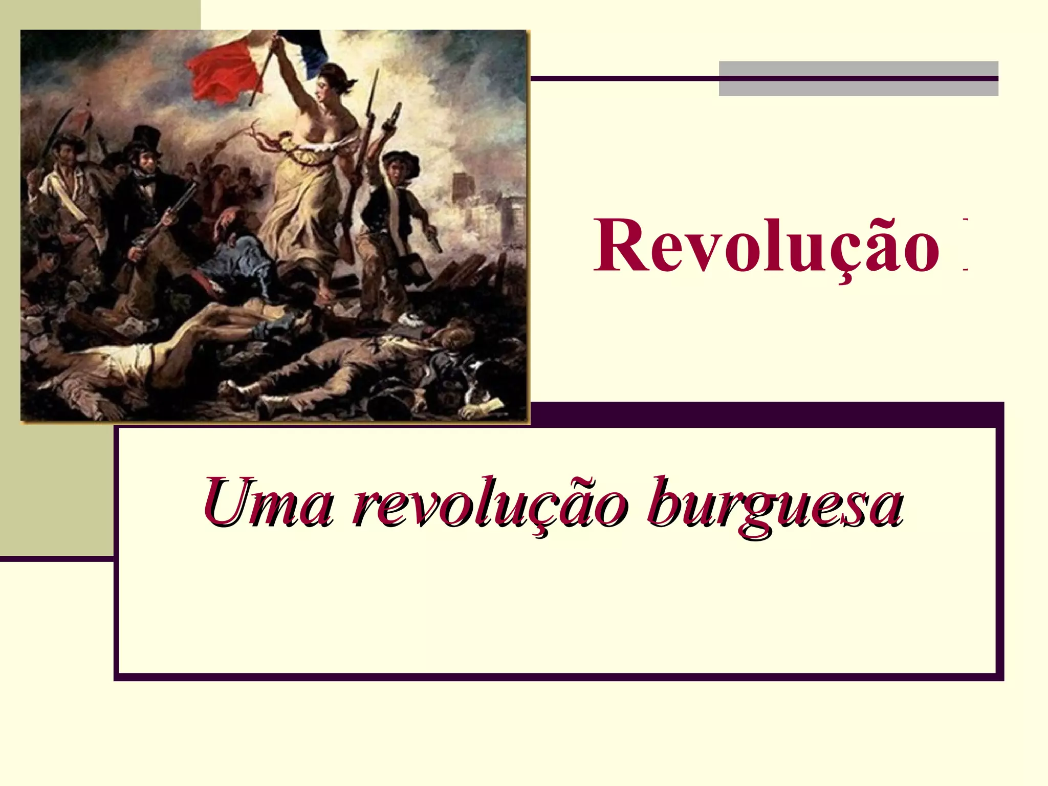 A Revolução Francesa (1789-1799) derrubou a monarquia absolutista e o feudalismo na França, estabelecendo uma república burguesa. Eventos-chave incluem a Tomada da Bastilha em 1789 e a execução do rei Luís XVI em 1793. A revolução passou por três fases: uma monarquia constitucional, uma república jacobina sob Robespierre, e um governo diretorial instável antes de Napoleão assumir o poder em 1799.