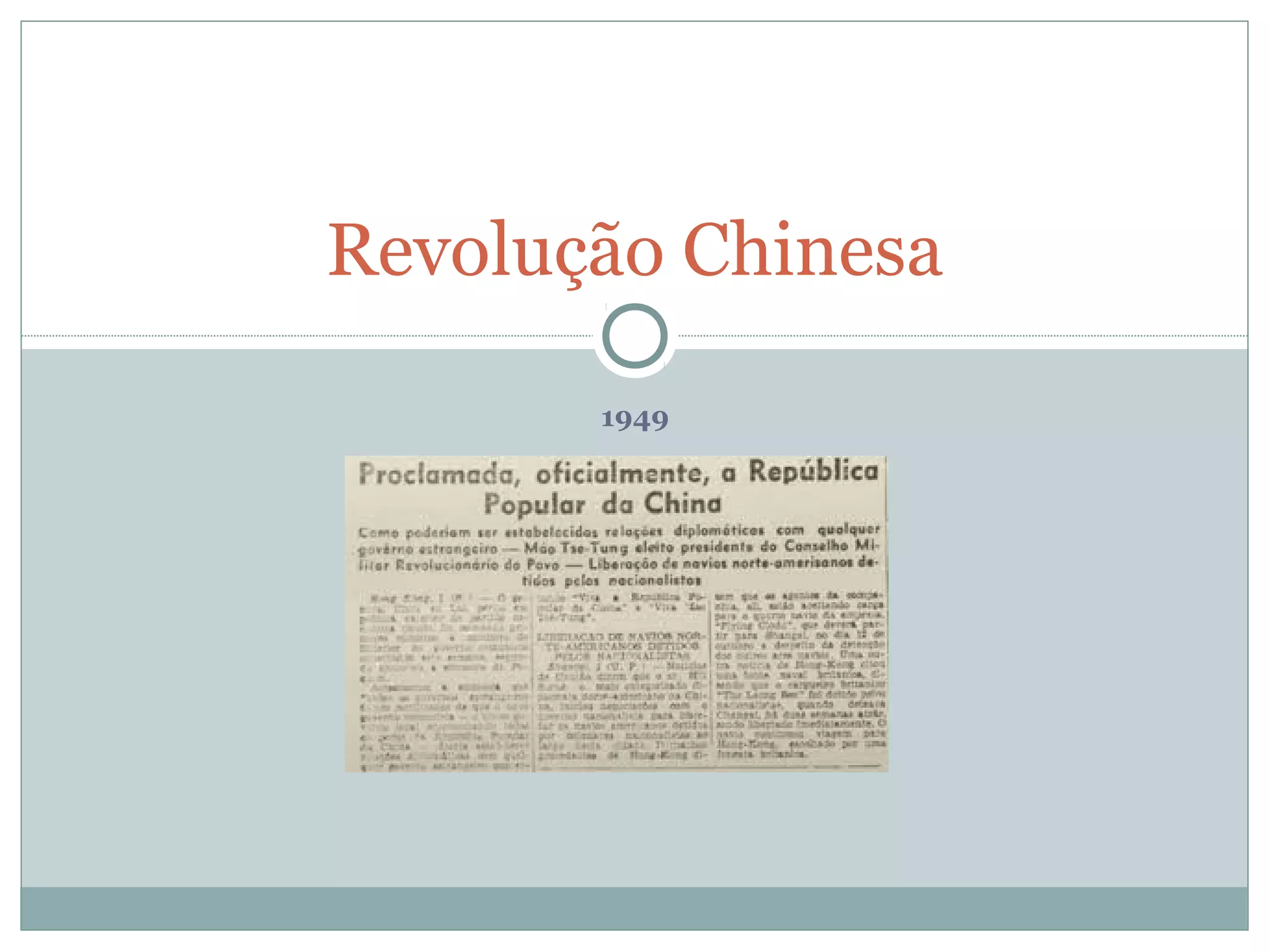 A Revolução Chinesa de 1949 pôs fim à dominação estrangeira na China e estabeleceu um governo comunista liderado por Mao Tsé-tung. Após anos de guerra civil entre nacionalistas e comunistas, Mao proclamou a República Popular da China em 1949 e implementou reformas radicais como o Grande Salto Adiante e a Revolução Cultural.