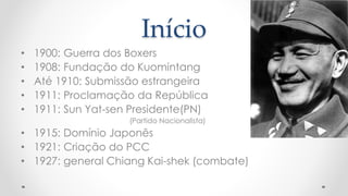 A revolução chinesa trouxe o comunismo ao poder em 1949, após anos de conflitos políticos entre nacionalistas e comunistas. Mao Tse-tung se tornou o líder supremo da nova República Popular da China, transformando o país em um estado comunista com economia aberta mas política fechada.
