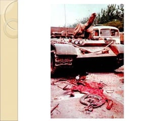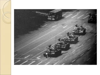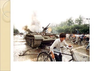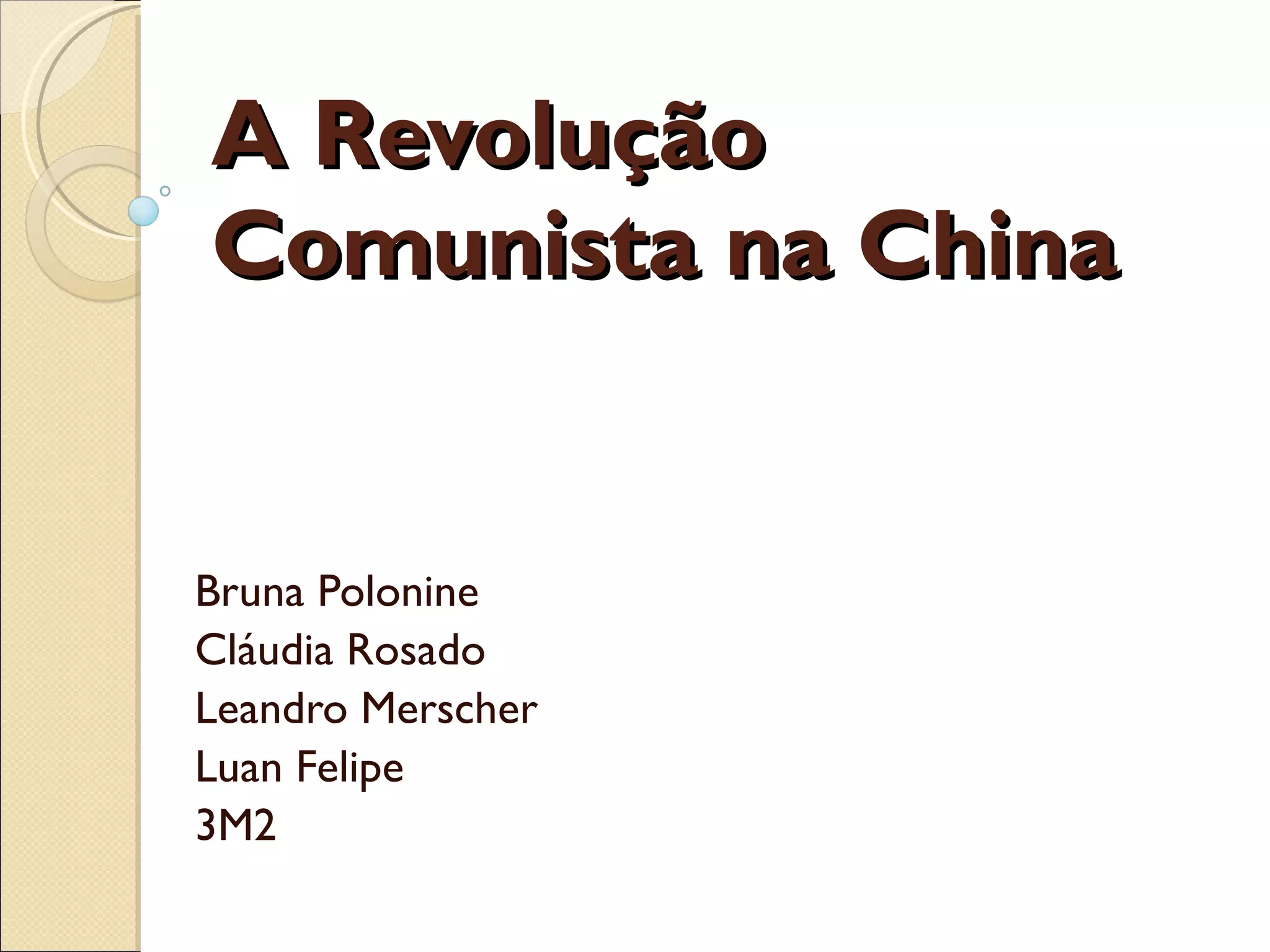 O documento resume a história da Revolução Comunista na China, desde o início do século XX até os dias atuais. Inicialmente, o Kuomintang liderou uma revolta que derrubou a dinastia Manchu em 1911, mas depois entrou em conflito com o Partido Comunista da China liderado por Mao Tsé-tung. Após a Segunda Guerra Mundial, Mao estabeleceu um governo comunista na China em 1949. Atualmente, a China tem um governo comunista, mas adota políticas econômicas capitalist