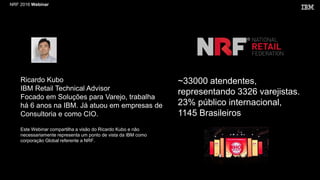 O webinar NRF 2016 discute a revolução digital no varejo, destacando a importância da personalização da experiência do consumidor e o uso de tecnologia, como assistentes virtuais e computação cognitiva. A crescente interação digital e a colaboração com as novas gerações são ressaltadas como essenciais para a inovação e sobrevivência no setor. Executivos do varejo expressam preocupações sobre a convergência das indústrias e a necessidade de adaptação às demandas dos consumidores modernos.