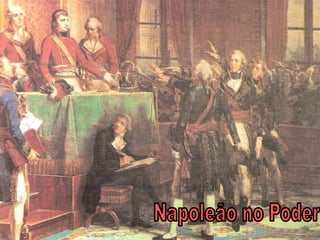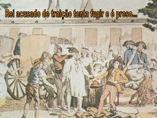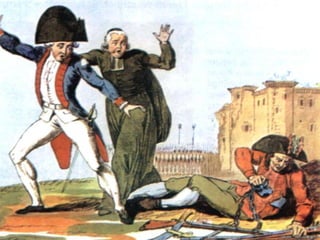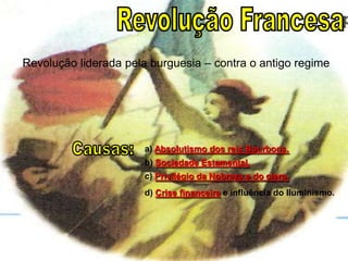 O documento descreve a Revolução Francesa de 1789, iniciada pela burguesia contra o Antigo Regime absolutista. A sociedade francesa era dividida em três Estados, com o clero e nobreza detendo privilégios. A crise financeira e as ideias iluministas levaram à convocação dos Estados Gerais e à formação da Assembléia Nacional, que declarou os direitos do homem. Isso desencadeou a queda da monarquia e o estabelecimento de um governo republicano, marcado por lutas internas entre fac