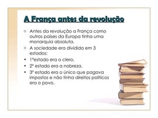 A Revolução Francesa ocorreu de 1789 a 1799 e transformou a França de uma monarquia absoluta em uma república. As causas incluíram crises econômicas, descontentamento social com a desigualdade entre os três estados e desejos políticos de mais direitos para o Terceiro Estado. Eventos importantes foram a queda da Bastilha em 1789 e a execução do rei Luís XVI em 1793. A revolução passou por fases de governo constitucional, república jacobina sob Robespierre e o "Reino do