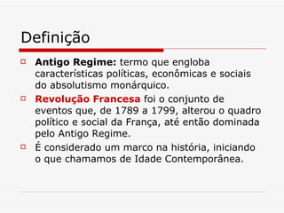 O documento resume as principais causas e fases da Revolução Francesa de 1789 a 1799. As causas incluem fatores financeiros, econômicos, agrícolas e políticos que levaram à insatisfação popular com o Antigo Regime absolutista. As fases descritas são a Assembleia Nacional Constituinte, a Convenção Nacional e o Diretório, cada uma marcada por eventos como a Declaração dos Direitos do Homem e do Cidadão e o período do Terror durante a Revolução.